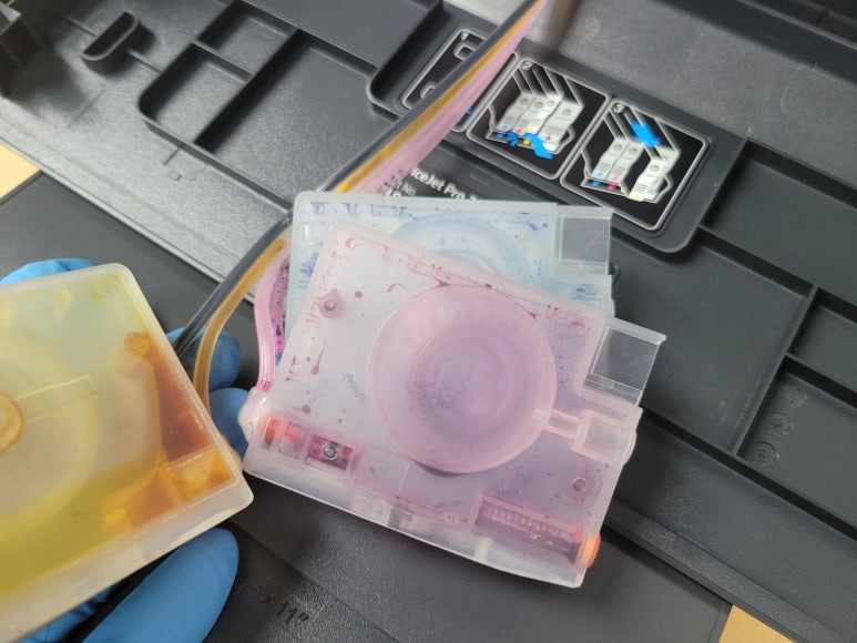 잦은 헤드 청소는 잉크손실, 내부오염, 헤드 노후화 및 칩판부 슈팅에어라인 비닐탈락, 챔버 터짐, 챔버 격벽 크랙 혼색, 노즐 훼손 등 영향을 줍니다. 헤드 격벽 크랙은 헤드 청소가 없더라고 사용중 충분히 생길 수 있는 부분이지만 잦은 헤드 청소는 더욱 빠른 노후 및 캠버 격벽 크랙을 가져 옵니다.