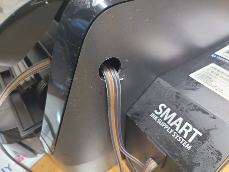 출력불량 및 잉크 카트리지 문제로 빠른 전체 점검 필요 이유 : 1. 호스 내 잉크 경화로 잉크공급 不 2. 카트리지 부싱 및 패킹 노후로 공기유입으로 잉크공급 不 3. 헤드 內 잉크공간 챔버 터짐 (칩판부 슈팅에어라인 비닐탈락, PCB 오염) 4. 스테이션 펌핑모터 불량으로 인한 잉크공급 不