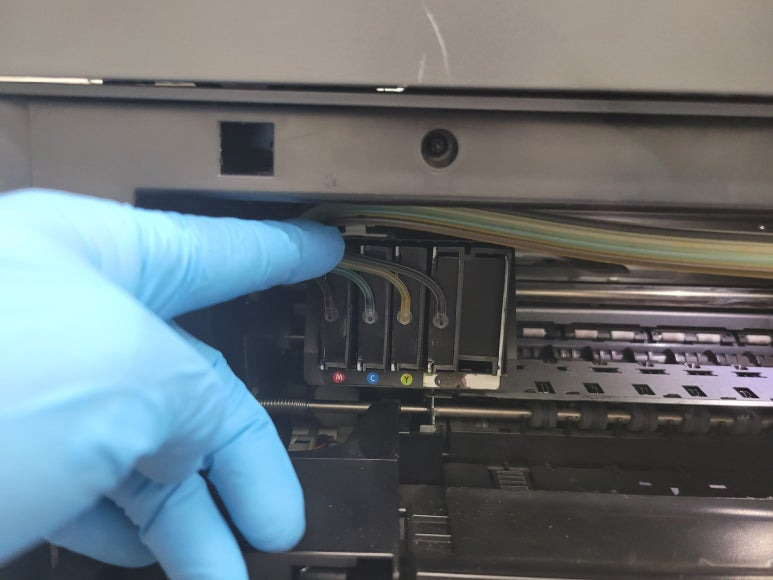 ● 프린터 헤드 클램프 부착 및 핫멜트 보강, 호스 재정리 장착