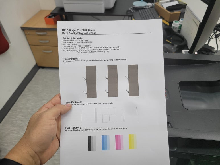 고양시 덕양구 향동동 현대테라타워DMC 소재, 사무실에서 스캔, 복사, 팩스 및 문서출력용으로 사용중인 HP 오피스젯 프로 8610 무한잉크 팩스복합기인데 출력불량 문제로 출장수리 요청하여 스케줄 잡아 이동, 출장수리 완료했습니다.