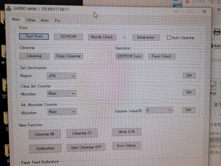 리셋 프로그램으로 잉크 압소바 카운드 리셋하고, 칼라 헤드 카트리지 교체를 하기로 했습니다.