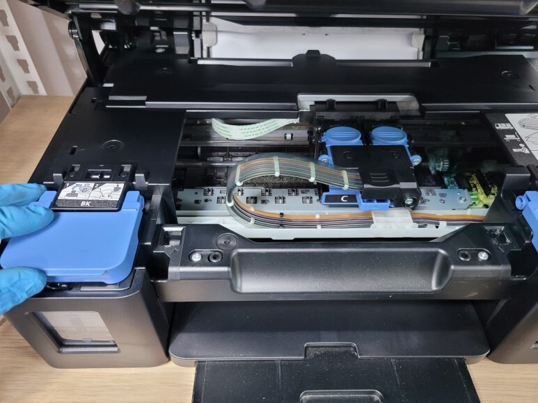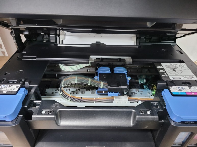 스탑 버튼을 5초씩 2회 눌러 캐리지를 중간에 두고 상부를 연 후, 블랙과 컬러 잉크 탱크 커버 레버를 열었습니다.